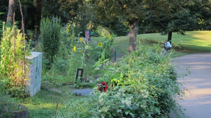 Die Idee, ein solches Projekt auch im Herzogenried zu realisieren, stieß auf offene Ohren. In der Stadtteilkonferenz der IGH im November 2013 wurde ausführlich darüber diskutiert. Am besten geeignet dafür erschien eine Fläche entlang des Durchgangs zwischen dem Neuen Messplatz und Steingarten. Er war völlig zugewachsen und Anziehungspunkt für zahlreichen Müll, der dort regelmäßig abgelegt wurde. Die Stadt Mannheim – es ist ja städtisches Gelände – konnte überzeugt werden und sagte ihre Unterstützung zu. Die Fläche wurde gerodet, mit gutem Boden aufgefüllt, die Wasserversorgung den Herzogenriedpark gesichert. Im März 2014 ging es los.